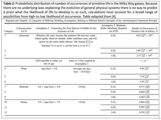 Así, en estudios como The Astrobiological Copernican Weak and Strong Limits for Intelligent Life [4], de Westby y Conselice, en el que utilizan datos para calcular la prevalencia de vida inteligente en la Vía Láctea, los investigadores deben recurrir a un análisis probabilístico que tiene en cuenta una serie de posibilidades que van desde un «escenario fuerte» con supuestos estrictos sobre la improbabilidad de que la materia evolucione hacia organismos vivos en cualquier exoplaneta habitable hasta un «escenario ultra débil» que es más permisivo en los supuestos subyacentes [Tabla 2]. Así, por ejemplo, bajo los supuestos más permisivos (ultradébiles) calculan una prevalencia de aproximadamente 4. 63 X 1010 (~40.000 millones) de casos de desarrollo de vida primitiva en planetas de nuestra galaxia, mientras que en los supuestos más estrictos (fuertes) consideran que debería haber al menos 36 civilizaciones inteligentes (comunicantes) en nuestra galaxia. Sin embargo, si se relajan las restricciones y los cálculos se hacen bajo el supuesto de que la vida tiene una probabilidad relativamente decente de desarrollarse en planetas rocosos donde hay agua líquida y una fuente de energía de baja entropía constante, entonces el número de posibles civilizaciones inteligentes en nuestra galaxia es exponencialmente mayor que sólo 36.