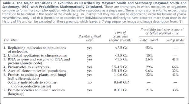 Por ejemplo, Andrew Watson en Implications of an Anthropic Model of Evolution for Emergence of Complex Life and Intelligence [6] deduce que sólo hay un 2,6% de probabilidades de que una de las transiciones principales en la evolución de los sistemas replicantes moleculares primordiales se convierta en células vivas (Tabla 3), lo que sugiere que es muy improbable que las circunstancias permitan la biogénesis en plazos similares a la duración de vida conocida de la biosfera terrestre (lo que apoya la hipótesis de la «Tierra rara»). Sin embargo, si tomamos en consideración la infodinámica operable desde un campo rector, como el código cuántico informacional de Meijer et al [7], la Resonancia Mórfica de Sheldrake [8], o el concepto de Info-Entropía Holomórfica de Chris Jeynes y Michael Parker [9], podemos hacer una inferencia racional de que la dinámica organizativa, rozando una verdadera fuerza entrópica efectiva o ley física de la complejidad, conducirá a los sistemas a una organización funcional cada vez mayor y la biogénesis será un resultado relativamente probable y universal allí donde las condiciones sean favorables para la habitabilidad biológica.