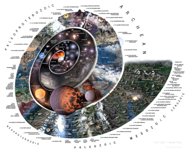 Figura 2. La historia de la naturaleza desde el Big Bang hasta nuestros días La historia de la naturaleza desde el Big Bang hasta nuestros días representada gráficamente en una espiral con los acontecimientos más destacados anotados. Cada mil millones de años (Ga) se representa en un tramo de 90 grados de la espiral. Los últimos 500 millones de años se representan en un tramo de 90 grados para conocer con más detalle nuestra historia reciente. Algunos de los acontecimientos representados son la aparición de estructuras cósmicas (estrellas, galaxias, planetas, cúmulos y otras estructuras), la aparición del sistema solar, la Tierra y la Luna, acontecimientos geológicos importantes (gases en la atmósfera, grandes orogenias, periodos glaciares, etc.) y la aparición y evolución de los seres vivos (primeros microbios, plantas, hongos, animales, especies homínidas…).