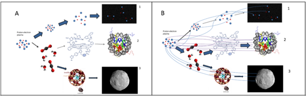 Figura 3. (A) Trayectorias potenciales de la evolución de la materia en el Universo (sólo para ilustración conceptual). Las flechas indican el grado relativo de probabilidad según los modelos convencionales, teniendo el camino potencial 1 el mayor grado de probabilidad, pero el menor grado de orden y complejidad; el camino potencial 2 el menor grado de probabilidad, pero el mayor grado de orden y complejidad; y el camino potencial 3 un valor medio de expectativa probabilística. (B) Efecto postulado de las interacciones no locales (correlaciones EPR) de la red de información del microagujero ERb=EPR sobre el desarrollo y la evolución de las estructuras atómicas y moleculares en el universo. Las conexiones de microagujeros de gusano ERb=EPR de alta densidad integradas en moléculas complejas y altamente ordenadas (vía 2) producen una interacción más fuerte a través de la dimensión temporal, así como intramolecularmente. Esto influye en la interactividad de los átomos de tal manera que existe una verdadera fuerza que impulsa a los sistemas a formar asociaciones complejas: un efecto negentrópico. El intercambio de información transtemporal, que aparece como un atributo de memoria del espacio, es un efecto ordenador que impulsa a la materia del universo hacia niveles superiores de organización sinérgica y complejidad funcional.