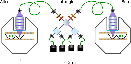 Figura 1: proceso de generación de entrelazamiento. Los iones de estroncio (puntos morados) y calcio (puntos verdes) están atrapados en dos trampas de Paul segmentadas y separadas. Los fotones emitidos por los iones de estroncio se recogen con objetivos de gran apertura numérica y se utilizan para generar entrelazamiento remoto entre los iones. Los iones de calcio se utilizan como qubits de memoria y procesamiento. Fuente de la imagen y descripción: Universidad de Oxford.