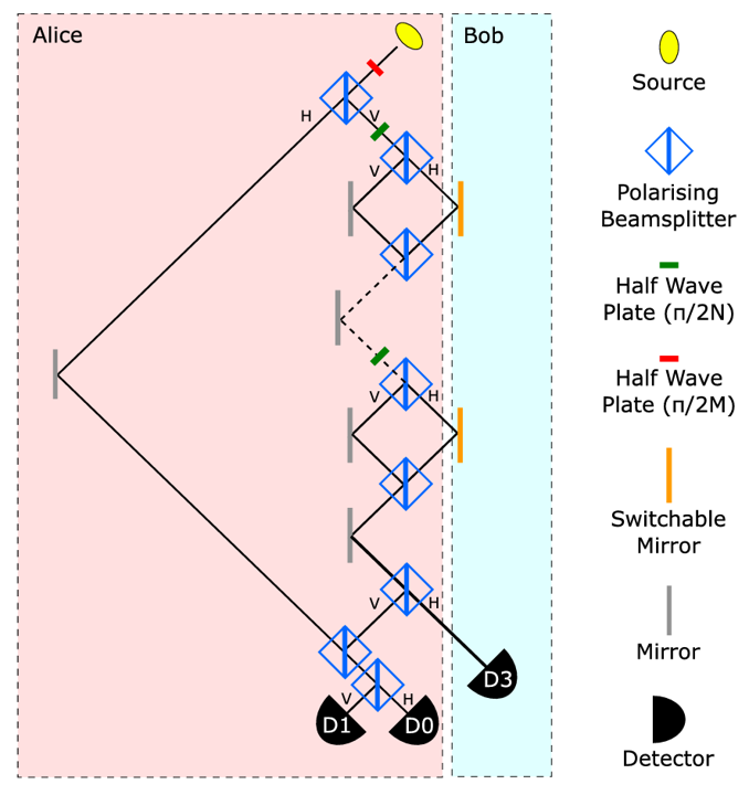 Figure 1. A schematic diagram of Salih et al.’s protocol for counterfactual communication, where, for every bit communicated, provably no photons have been sent to Bob. Beam splitters split a photon’s probability amplitude between the two eigenstates that correspond to the photon going in each direction; in the classical case, they split the beam intensity (and field). As interference still occurs, when Bob does not block, waves on both sides still destructively interfere, so the light never returns to Alice. However, Bob’s D3 and Alice’s D0 both detect light simultaneously. Similarly, when he blocks, light goes to his blockers and Alice’s D1 simultaneously. Therefore, in both cases, as light goes between Alice and Bob, it is not counterfactual. The only way to avoid this is to force the light to end at only one point – to postselect, with information only travelling when nothing goes between Alice and Bob. Only single photons can do this. Therefore, the only way to make the protocol counterfactual is to use these, and so make the protocol quantum. Image and image description reproduced from [12]: Hance, J.R., Ladyman, J. & Rarity, J. How Quantum is Quantum Counterfactual Communication?. Found Phys 51, 12 (2021). https://doi.org/10.1007/s10701-021-00412-5.
